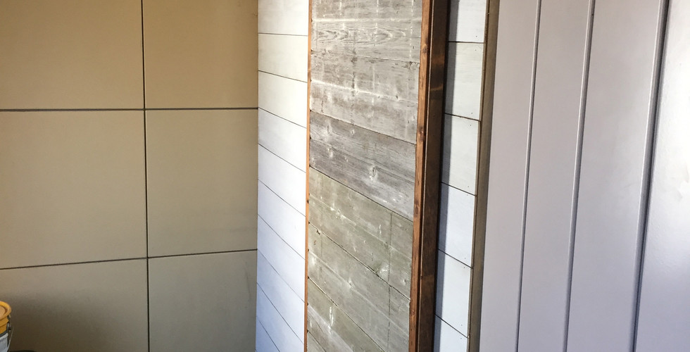 The kitchen sink, washer/dryer, bathroom sink and tub were all hooked up and all leaks fixed! Next the living room was given barn wood accents around the inset window and to frame the TV - which was the large hole left from the Lustron mirror and bookshelf. Twelve rounds of mudding, drying and sanding in the cold and dark was what it took to make it into the beautiful display feature today - just saying!